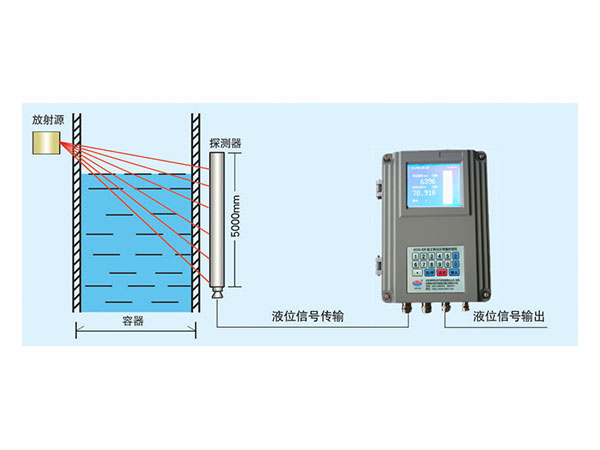 系統(tǒng)概述HDS-EN系列核子料位計利用能量衰減來測量料位。放射源安裝在容器的一側(cè),棒狀探測器安裝在容器的另一側(cè)。γ射線穿過容器壁和物料上層空間到達探頭。當(dāng)物料的料位增加時,到達探頭的能量減少。儀表的電子回路將這種能量的變化轉(zhuǎn)化為料位的在線檢測。利用這種技術(shù)可以獲得高精度的料位讀數(shù)和料位變化的快速反應(yīng)。主要用于多種反應(yīng)器﹑容器和煤倉中的液體和散狀物料的料位高度。與容器內(nèi)被測物料物理、化學(xué)性質(zhì)無關(guān),特別適用高壓、強腐蝕、高粘度、結(jié)皮、高溫、高粉塵環(huán)境。 系統(tǒng)主要技術(shù)參數(shù)◇ 測量范圍:0-10m;若采用多線程方式,可測量數(shù)十米范圍內(nèi)連續(xù)性液(料)位變化?!?料位測量精度:≤±3.0%滿量程◇ 時間濾波常數(shù):0-1000s◇ 防爆等級:Exd[ia]ⅡCT6 Gb 防護等級:IP65◇ 接收探測器:采用棒狀閃爍體探測器和電離射線探測器?!?儀表線性化:采用對數(shù)和多點信號標(biāo)正?!?放射源:采用Cs137或Co60,活度10-8000mCi范圍,活度大小視現(xiàn)場情況而定◇ γ源由特制防護罐進行屏蔽,經(jīng)衛(wèi)生環(huán)保部門現(xiàn)場檢測符合國家相關(guān)安全標(biāo)準(zhǔn),不會對人體產(chǎn)生損傷,請用戶放心◇ 探測器:輸出0-5V/0-100kHz脈沖料位(液位)信號輸送二次儀表。傳輸距離可達500米?!?具有兩路全隔離4-20mA在線連續(xù)料位(液位)信號、全隔離4-20mA PID控制輸出?!?料位上下超限開關(guān)量報警。繼電器觸點容量:250VAC 5A或30VDC 5A。 系統(tǒng)特點:◇ 采用長壽命、高靈敏、高效率的閃爍探測器,探測靈敏,可大大減低放射源的用量,保證環(huán)境的輻射安全;◇ 非接觸的設(shè)計使在線料位測量系統(tǒng)非常適合在磨蝕、腐蝕、高溫、高壓的環(huán)境中應(yīng)用?!?伽瑪輻射技術(shù)不受過程參數(shù)如壓力、溫度、粘度或密度變化的影響?!?高敏感的探測器可以使用小活度放射源達到高測量精度,測量的重復(fù)性是探頭量程的1.0%?!?采用寬工業(yè)級輸入電源模塊,滿足工業(yè)現(xiàn)場電源瞬變的需求,新式的穩(wěn)峰技術(shù)確保儀表長期穩(wěn)定的運行?!?采用320*240高分辨率液晶顯示,中文字幕顯示菜單,簡潔明了;在線操作提示,真正實現(xiàn)無紙化在線標(biāo)定調(diào)試操作。◇ 儀表可在線柱狀圖形顯示容器內(nèi)料位數(shù)度值變化,提供瞬時料位變化曲線查詢功能。 核子料位計、液位計工藝現(xiàn)場安裝示意圖
